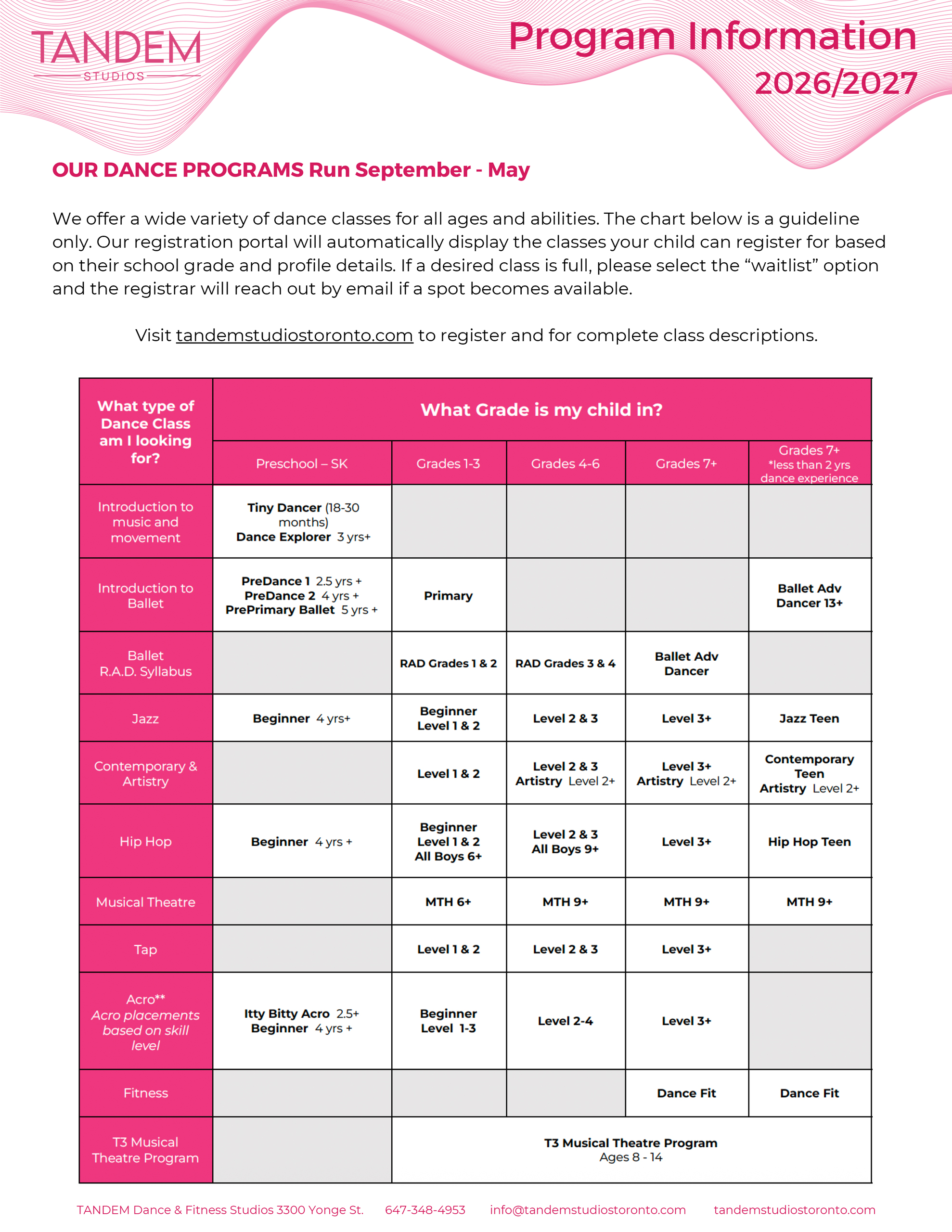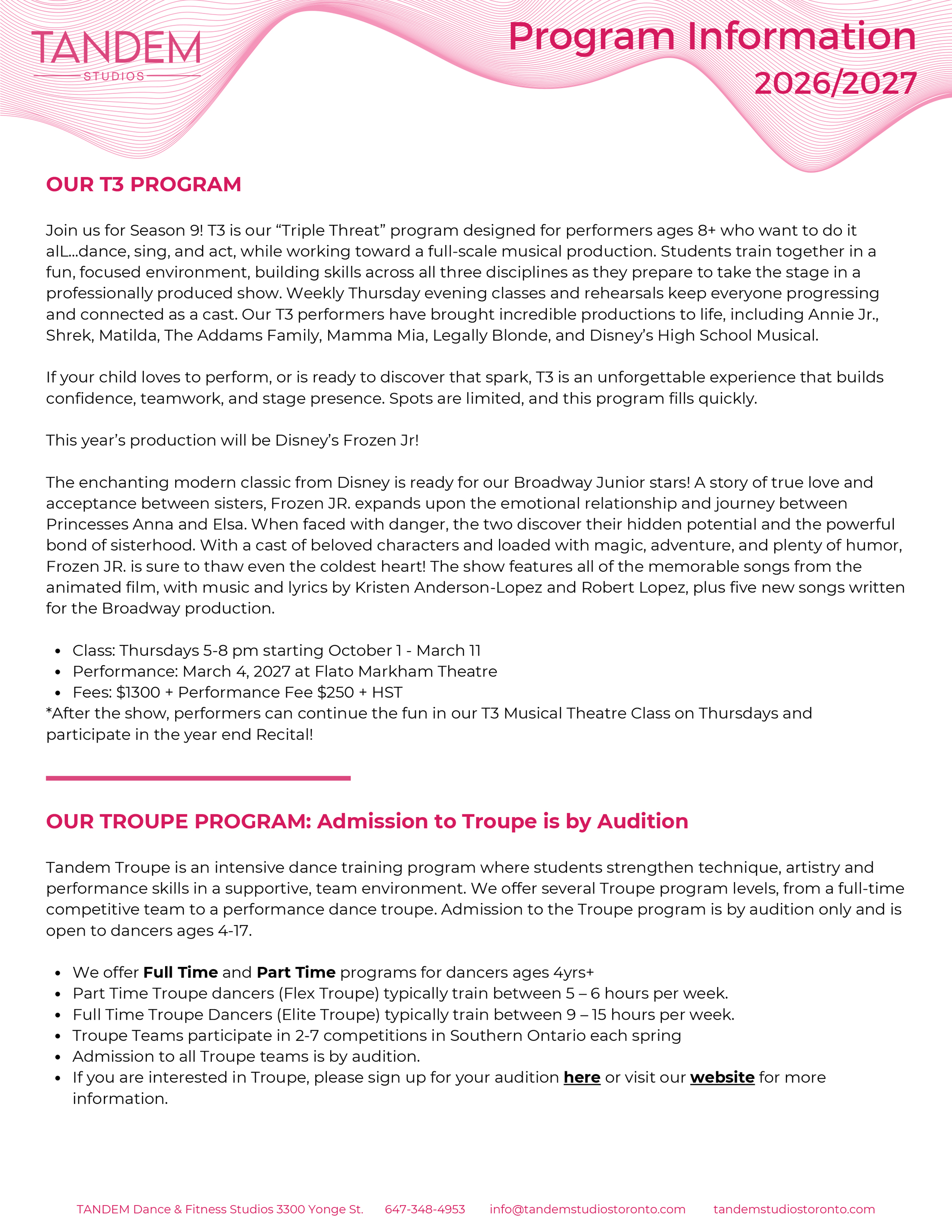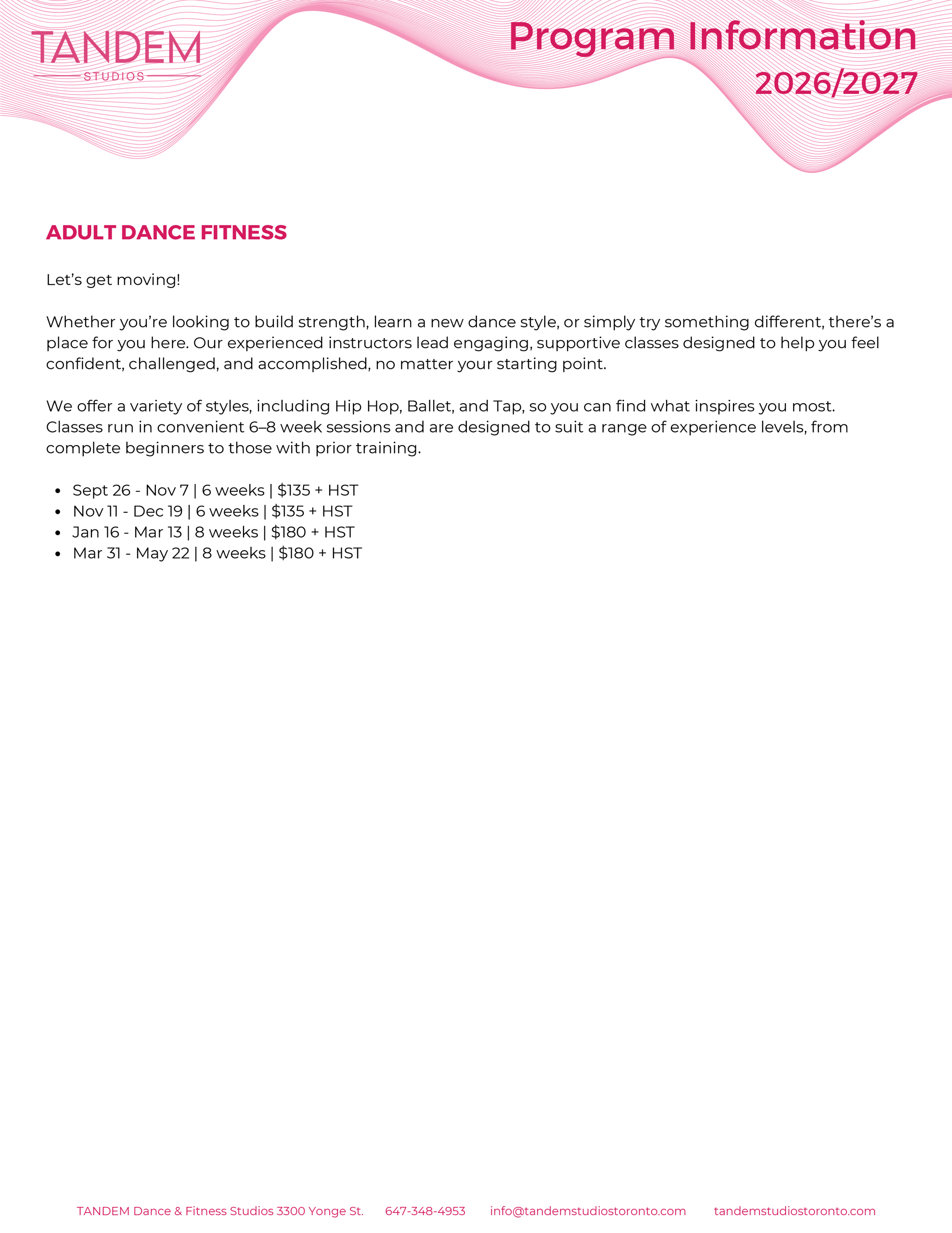 Program Information & Pricing Below is our dance programs & pricing pdf to view and download. Dance Schedule PagePrograms & Pricing Download